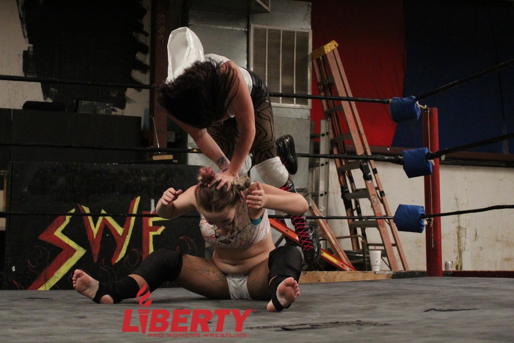 Newcomer Katie Ohno makes her Liberty Pro debut against mainstay Fantasy. Katie initially takes the upper hand, hoping to impress everyone in her first match. But Fantasy, tough as nails, makes a comeback, making the contest a real challenge for the rookie. Will Katie Ohno upset the veteran Fantasy, or will Fantasy show her the ropes? Enjoy 10 minutes of action. (introductions. Lockup. Hip Toss takedown. wrist lock. Armbar. Big right hands. Kicks to midsection. Clothesline. Stomping on toes. Knife edge chops. Knee smashed into face. Jumping face plant into mat. Snapmare. Foot grinding forehead. Hanging the opponent upside down in the corner. Dropkick to face. Suplex. Body Scissors. Hair Pull. Biting her toes. Finisher: Knee smash into face with modified stunner. pin.) The use of terms for holds and moves may vary.