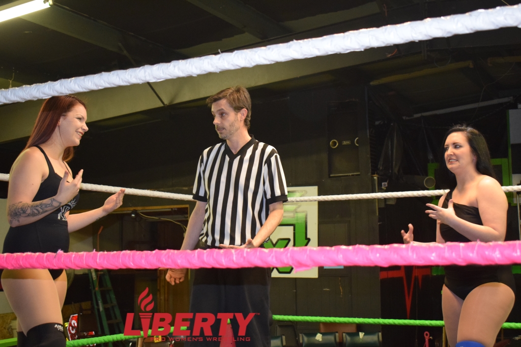 Former friends turned foes, Flawless Skyler and Katelynn Black, make their Liberty Pro debuts in this intense fifteen-minute match. Their rivalry escalates as they showcase their wrestling skills and leave no room for reconciliation. (introductions. Lockup. Monkey flip. Snapmare. Short clothesline. suplex. Wrapping hair around ropes. Blatant choke. side headlock. flying cross body. Knee lift to midsection. armbar. Dragging opponent back to the ring by hair. Face slam into apron. Slamming face into ring post. Boston crab. chinlock. standing on hair. Choking on middle rope. Hip Toss takedown. Double handed hair pull. Hair mare. Knee across throat. Raking face across rope. Finisher: Sunset Flip. pin.) The use of terms for holds and moves may vary.